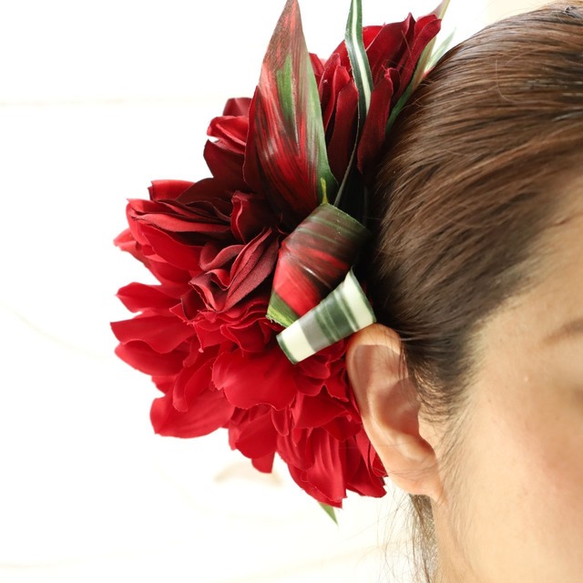 【こちらの商品は、ご注文いただいてから作成します】 複数ご注文希望の方は、お問い合わせください。 フラの舞台・ステージに最適! 存在感と豪華さ抜群! 舞台映えする!赤ダリアのコームです。 おすすめの髪型はシニョン(お団子) シニョンの根元に差し込むだけなので、簡単にしっかりと付きます。 (✳︎絶対に取れないという保障はありません) 髪が少ない方でも、シニョンの根元なら比較的しっかり付きます。 もしくは、シニョンに付け毛をして髪の量をボリュームアップさせ、そこに差し込むのもオススメです。 それでも、髪の量により不安な方はピンで止めて使用してください。 大人っぽくて、後ろ姿も思わず写真を撮りたくなるような豪華さ。 ★【大きさ】 横約18㎝・高さ約12㎝ ★【発送目安】10日〜14日間 ★【配送方法】ゆうパック ・丁寧に梱包してお届けします ★【送料について】 ・サイズ・地域別に送料を頂戴しております。 ・合計17,000円以上で送料無料 ・2個まで60サイズ ・3個 80サイズ ★花材は欠品や廃盤などにより、代替えのもので用意する場合がございます。 欠品・代替えの場合はその旨をお伝えいたします。 ★1つずつ手作りなので、多少の花の向き、グリーンを入れる位置など多少画像との違いがございます。 ★したがって、画像との違いやイメージの違いでの返品・交換はご遠慮ください。 ★丁寧にしっかりと作り込んでおりますが、 保管場所や持ち歩きの際の刺激など、状況により 破損する場合もございます。 箱に入れての保管や持ち運びをお勧めいたします。 ★故意な破損ではなく、1週間以内に花がとれたり破損が起きた場合には無料でリペアいたしますので、お問い合わせください。